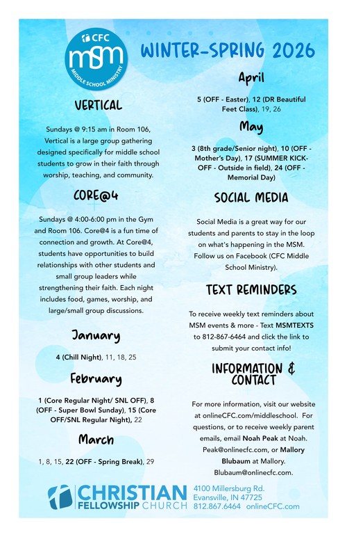 Social Media: Another way to stay connected and find out what's happening in the MSM is through our Facebook (CFC Middle School Ministry).