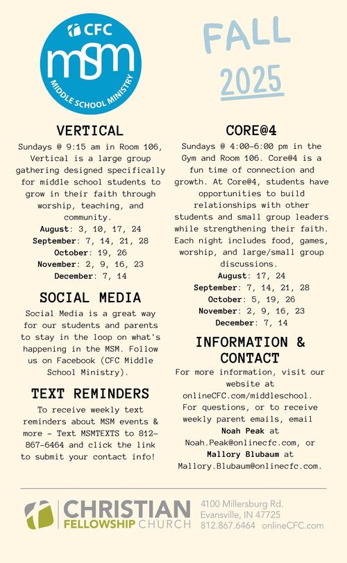 The Middle School Ministry (MSM) at Christian Fellowship Church exists to aide your family in raising your student in the Lord. Our hope is to provide your family with resources and to be another voice that points your student to our great God and Savior Jesus Christ. In order to do so, we provide the following opportunities for your student to connect to the church, the body of Christ: