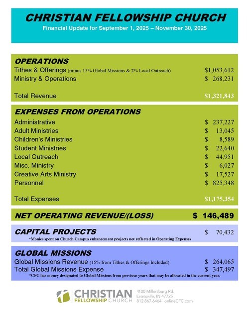CFC's fiscal year runs from September 1 through August 31. Below is our latest quarterly operations report. If you have any questions, please contact the church office.
